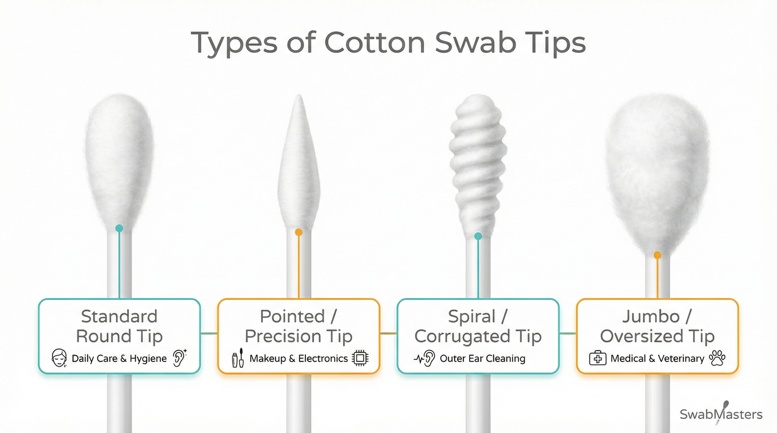 Are all cotton swabs the same? Not even close. If you think a cotton swab is just a simple stick with cotton on the ends, you might be surprised. The world of cotton swabs is vast and highly specialized. Choosing the wrong type of cotton swab can lead to poor performance, safety risks, or environmental harm. Whether you are a consumer looking for the best eco-friendly option, or a business buyer sourcing medical-grade supplies, knowing the different types of cotton swabs is crucial. As a leading manufacturer with 26 years of experience since 2000, SwabMasters has produced billions of cotton swabs for global brands like MINISO and Sam’s Club. We know exactly what goes into making the perfect swab. In this comprehensive guide, we will break down the different types of cotton swabs by stick material, tip shape, and industry use. We will also take you behind the scenes to show you how high-quality cotton swabs are manufactured. Let’s dive in. What Are the Different Types of Cotton Swabs by Stick Material? When categorizing the different types of cotton swabs, the stick material is the most important factor. The material determines the swab’s flexibility, strength, and environmental impact. At SwabMasters,